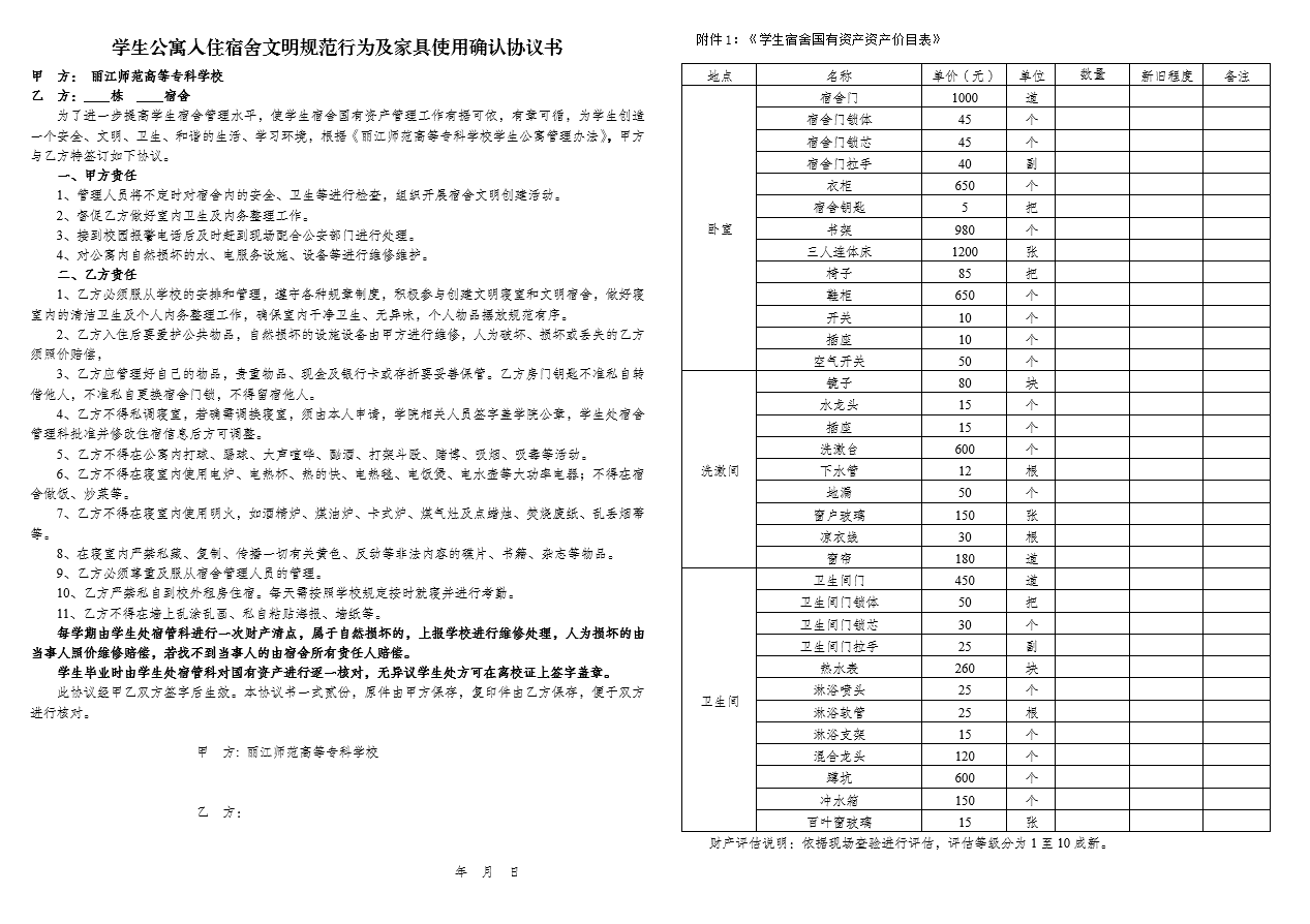 为了进一步提高学生宿舍管理水平,实现学生公寓管理的规范化、精细化、科学化,使学生宿舍国有资产管理工作有据可依,有章可循,明确学校和入住学生的责、权、利,为学生创造一个安全、文明、卫生、和谐的生活、学习环境,根据《丽江师范高等专科学校学生公寓管理办法》,2021年9月15日学校与入住学生公寓的学生签订了《学生公寓入住宿舍文明规范行为及家具使用确认协议书》。